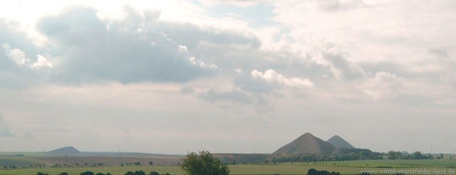 Bild 01 - Die drei Mansfelder Pyramiden - Halden des (v.l.n.r.) Wolfschachtes (Fortschrittschacht), Paulschachtes (Otto-Brosowski-Schacht) und Vitzthumschachtes (Ernst-Thälmann-Schacht) im Jahr 2009 Foto: G. Roswora
